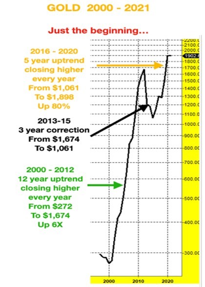 I expect gold to do as least as well in coming years as the 2000 to 2012 run which was a compound annual growth rate of over 20% for 12 years.