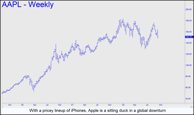 Which brings us to the bear rally in stocks. I've been looking anxiously over my shoulder, waiting for a crazy-loco short-squeeze to make investors forget we are so deeply in debt that only a full-blown depression can pay it off. This will come mainly through bankruptcies, in relentless deflationary waves that will make us nostalgic for today's rampaging consumer inflation. Wall Street chose AAPL to distract us from this grim reality, but the ruse failed. Employing subterfuge that I described here in great detail and with relatively small outlays of cash, DaBoyz levitated the biggest-cap stock in the world to within 3.7% of new all-time highs. Unfortunately, they were unable to hold Leviathan aloft indefinitely until the broad averages faked their way higher against the weight of a bear market.