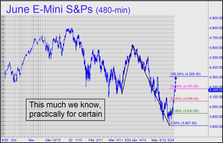 There's no relief in sight for gas prices that seem headed to at least $10 per gallon. The chart above suggests July crude will likely hit $128 this week or early next, a whopping 7.5% gain over last week's high. But watch out if the futures shred their way past this Hidden Pivot resistance since that would portend a continuation of the trend to $140, a target first drum-rolled here several weeks ago. It's a safe bet that Californians will be paying $10 or more for gasoline by then, even if far fewer of them are driving. Realize that it is not consumer demand that has been pushing up prices, or even conspiratorial constraints on supply, but rather a flood of speculative money into energy resources as a hedge against inflation.