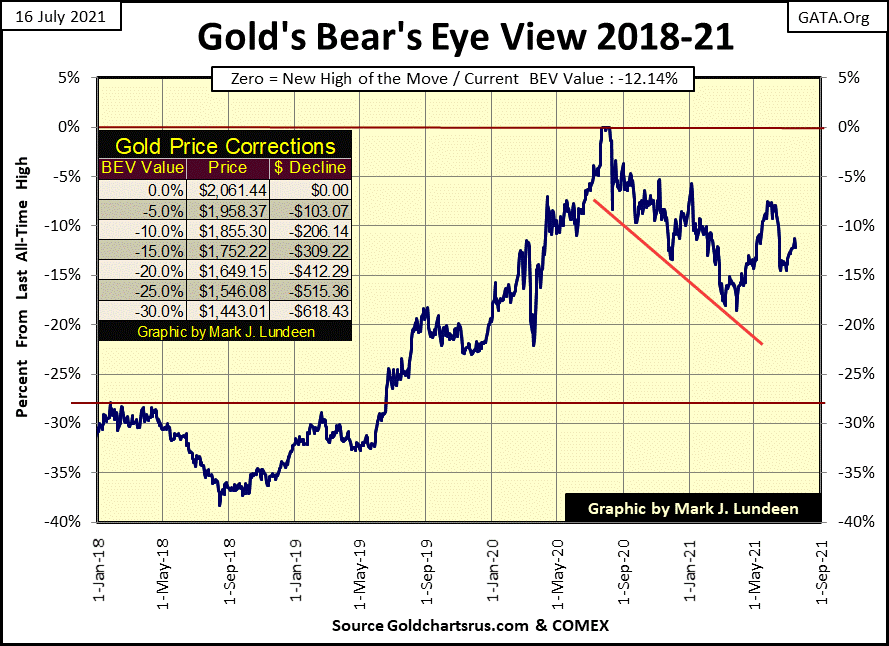 So much for all of that! Time to move on to something more pleasant to consider, something like gold’s BEV chart below. Gold last week didn’t do much, but it did close the week closer to its BEV -10% line than to its BEV -15% line. All and all, there are good reasons to continue assuming the lows of the post August 2020 correction are in, and the next BEV line to be crossed is gold’s BEV -10% line.