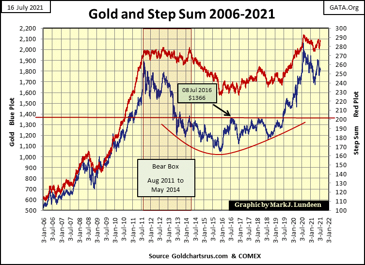 Not much new is happening with gold’s step sum chart below, but it continues looking bullish. The prospects of gold seeing some real up-field running, as seen from 2006 to 2011 below, are excellent when these plots below finally break above their highs of August of last year.