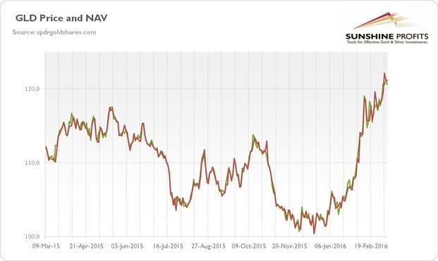 The price of GLD (green line) and the SPDR Gold Trust’ Net Asset Value (red line) for the last twelve months.