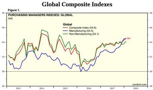 The index was propelled by major yearly gains in copper, which had its best month in 30 years in December, oil, which moved above $60 a barrel for the first time in over two years, and gold, up for the second year in a row, by 12.5% in 2017. The roll continued into the New Year, with the index hitting a three-year high on Jan. 5 due to what the Financial Times described as the global economy’s best period of growth (measured in manufacturing activity) since the 2008 financial crisis.