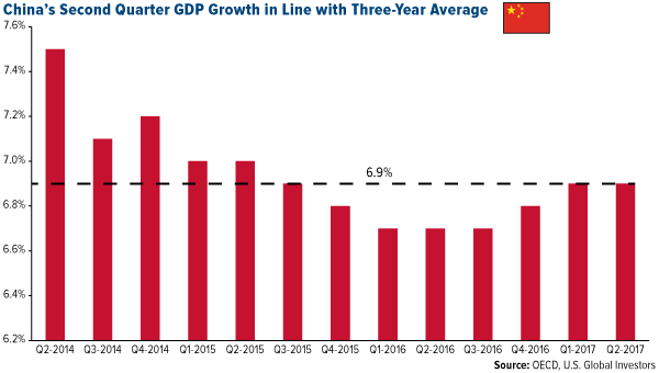There have been recent fears among economists and investors alike that China’s debt-fueled economy would contract as it transitions from old-school manufacturing to services, but the Asian giant has been far more resilient than most anticipated. Its gross domestic product (GDP) for the second quarter rose 6.9 percent over the same period last year, beating expectations and putting the country on track to meet the International Monetary Fund’s 2017 growth forecast of 6.5 percent.