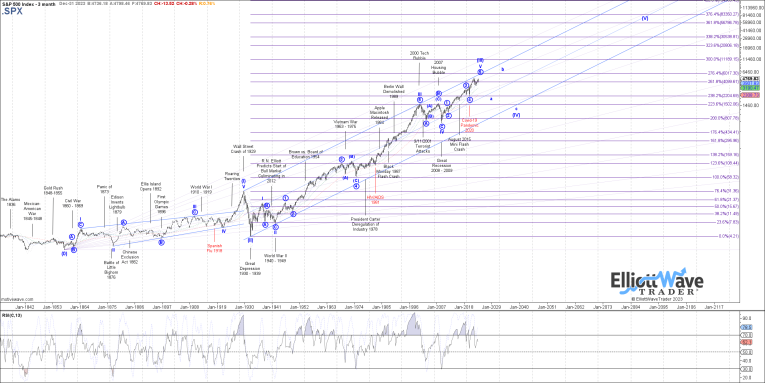 First, I want to note that the rally off the October 2022 low seems to be taking shape as something we call an "ending diagonal." What we know of ending diagonals is that once they complete, they strongly reverse back to the region from which they began. In our case, it would mean a strong reversal back down to the 3500-3800SPX region. Should we see that in the coming year or so, that would be our first step in the confirmation process.
