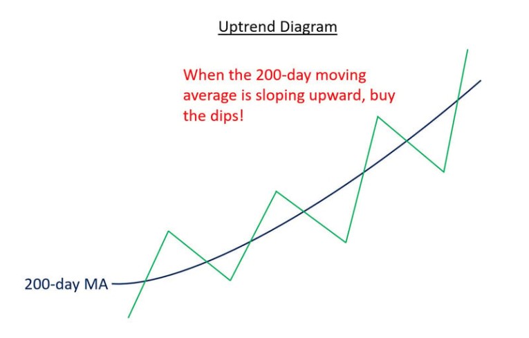 The diagram below illustrates a confirmed uptrend based on the 200-day moving average, showing how oversold readings or dips are typically short-lived and typically followed by further gains: