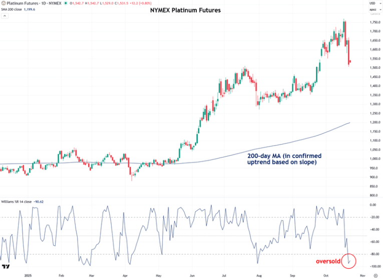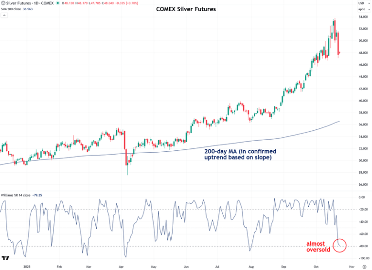 Like gold, silver is also in a confirmed uptrend based on the 200-day moving average. However, it has already nearly reached oversold levels on Williams %R, indicating that the selloff has largely run its course.