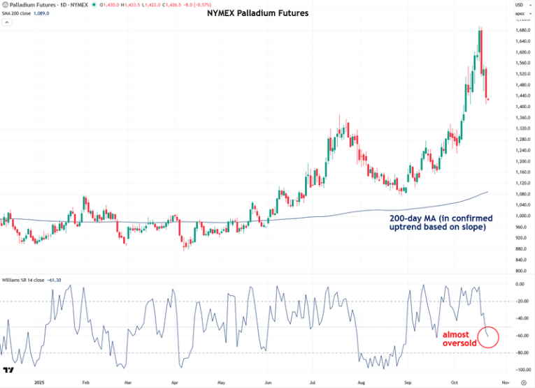 Palladium is also in a confirmed uptrend, but like gold, it hasn’t yet reached oversold levels according to Williams %R. However, it is likely to do so soon, which should set it up to recover and continue its bull market.