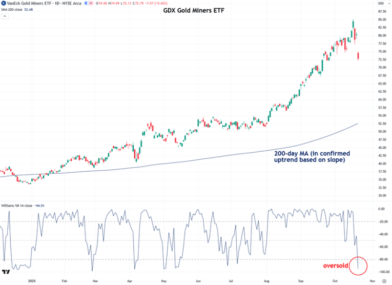 Next, let’s move on to mining stock ETFs, starting with the popular GDX gold mining stock ETF. After its sharp decline over the past week, GDX is now in deeply oversold territory but remains within an uptrend according to the 200-day moving average.