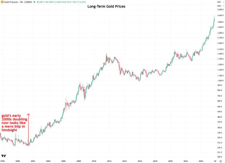 I believe the same will be true of gold’s recent doubling. When gold reaches $15,000, $20,000, and eventually well beyond that, this early move will look just as minor.