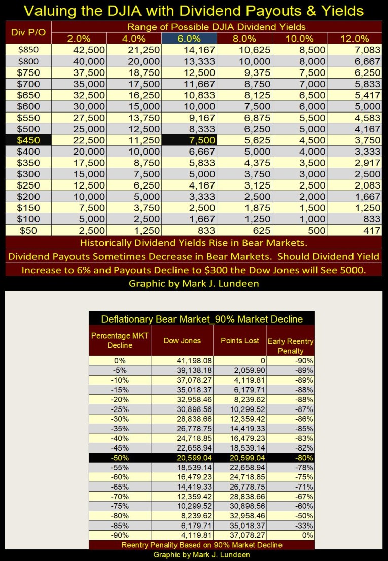 What happens when we take the dividend extremes from the Great Depression, cut 75% from the Dow Jones dividend payout, and have it yield 10%? In the table below, that would take the Dow’s payout down its $200 row. With a 10% yield, that would fix the Dow Jones valuation at 2,000 in the table, a 95.14% market decline for the Dow Jones, a market decline that exceeds the July 1932, 89% bottom in the Dow Jones.