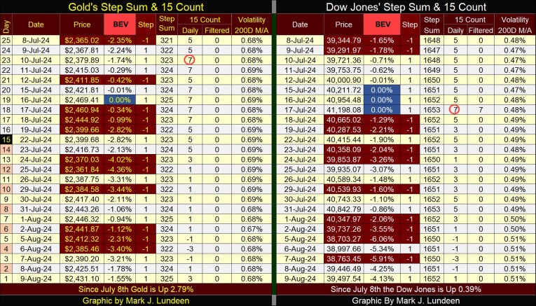 I did something different this week in the graphic below, combined the BEV charts of both gold and the Dow Jones, from 01 October 2022 to this week’s close. Take a moment to study, and compare them.