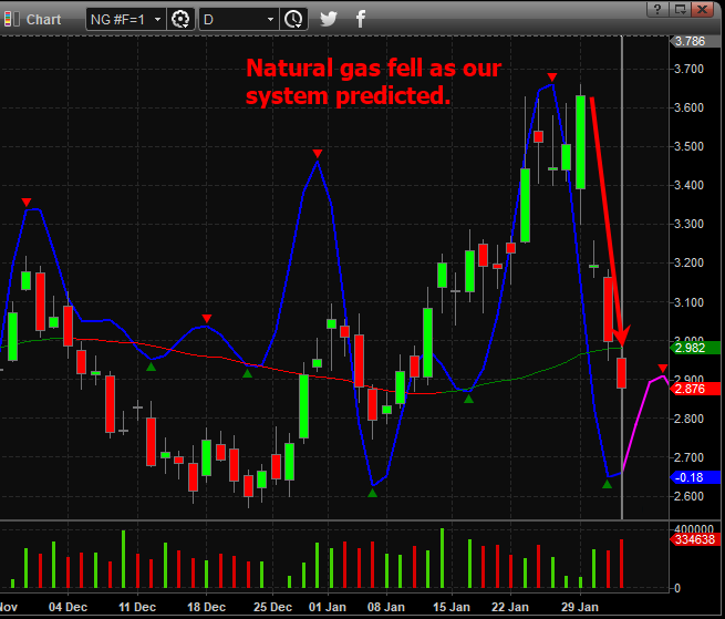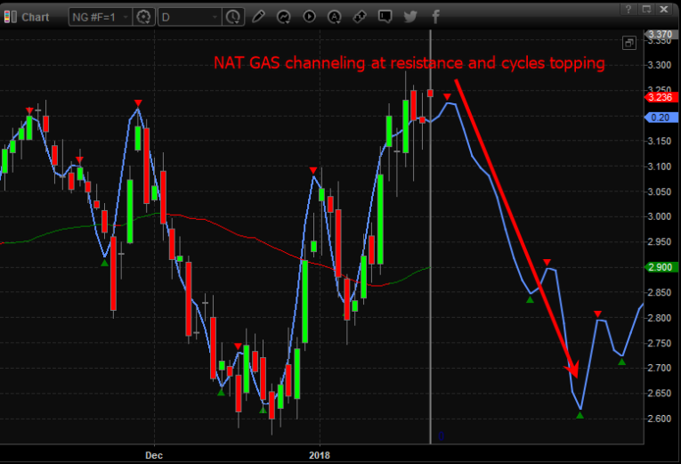A week ago we saw natural gas hit resistance and our cycle analysis also indicated the timing was about right for the price to start to fall.