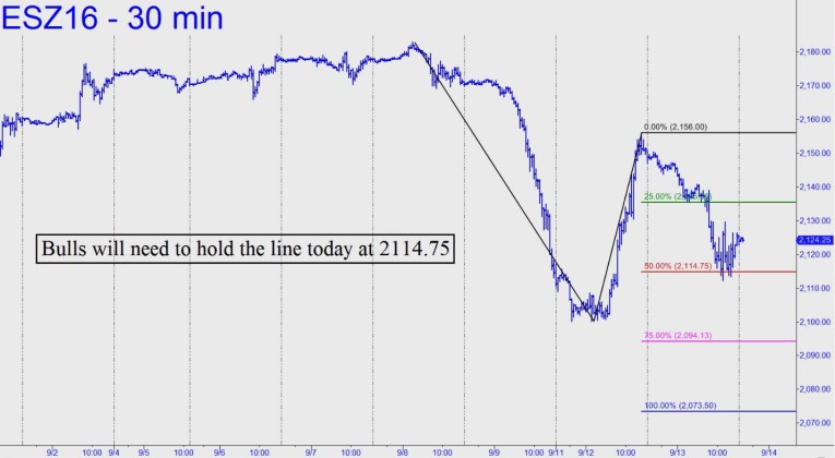 Today’s price action generated a distinctive pattern on the intraday charts with the potential to tell us whether the powerful selling we’ve see in recent days might be the beginning of a bear market. Notice how this morning’s follow-through to Friday’s steep plunge stopped almost precisely at the red line around mid-session. The line is a key ‘Hidden Pivot’ support at 2114.75, and if it were to be breached decisively — meaning by about six or seven points — that would strongly imply more downside is coming to at least 2073.50, the ‘D’ target of the pattern.