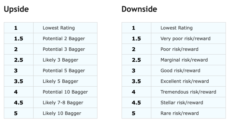 I currently don't use ratings that capture ten bagger or higher upside potential, because those kind of gains are nearly impossible to predict. My website does provide a list of stocks with 20+ bagger potential. However, many of these stocks have ratings below 3 because the risk/reward profile is much less than ideal.