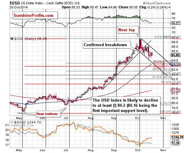Why? The USD Index is likely not done declining and the long-term resistance lines in gold have not been reached. What we wrote about these markets yesterday and on Friday remains up-to-date. Still, we would like to show you the latest short-term USD chart as we have added a target area to it (charts courtesy of http://stockcharts.com).