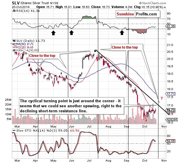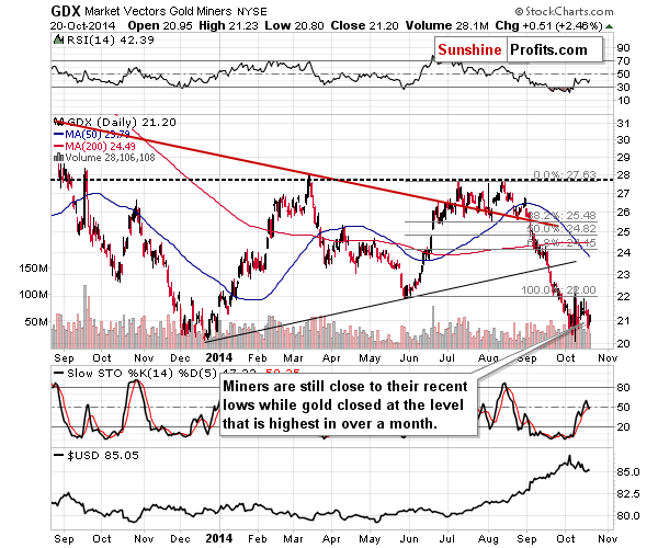 Now, in the case of mining stocks, what we see on the above chart per se is less important than what we learn when we compare it with the chart of gold. The above chart tells us that miners rallied yesterday, but the miners-gold link tells us that miners are still weak. This is particularly discouraging because the general stock market moved higher once again yesterday. In other words, we saw Friday’s bearish signal once again – miners did not soar or catch up with gold, even though they “should have”.