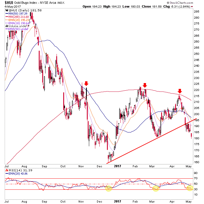 HUI is torn, frayed and downright bearish. What’s more, it’s been bearish since it started to drop from the SMA 200 failure point.