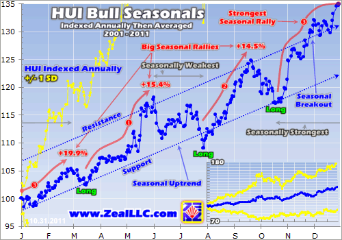 Between 2001 and 2011, the HUI gold-stock index enjoyed utterly-amazing average returns. By the end of each calendar year, on average the HUI had soared 35% higher! This is phenomenal during a secular stock bear where the general stock markets were dead flat at best over this past decade. The HUI carved a strong seasonal uptrend over this span, with definite support and resistance lines you can see above.