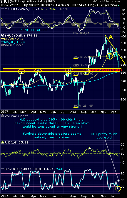 The HUI has approached the strong support area in the 360 -370 range again. The 360 - 370 range has served as a long-term resistance for more than 16 months and serves now as strong support indeed! Furthermore it should be noted that the HUI is pretty much over-sold so further down-side risk seems almost non-existent.