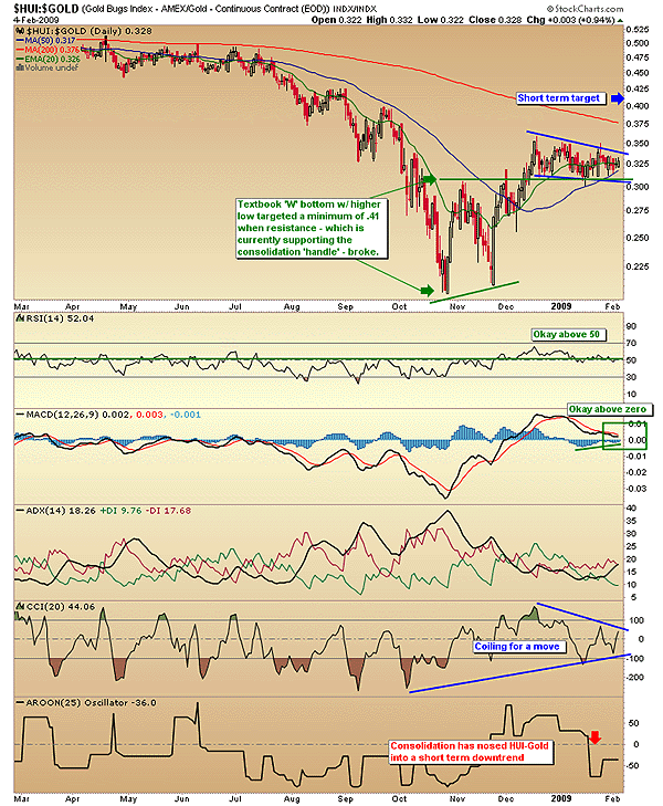 Let's take a look at one of the more popular gold market indicators, the HUI-Gold ratio, which is often a leading indicator for the gold sector. Because it is so popular, there are lots of people looking at it, which of course means that you and I are not the only geniuses trying to gain an edge in this market. We all see the same thing, but do we all interpret it the same?