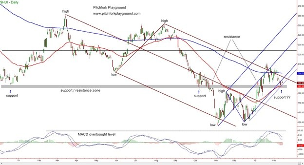Notice how the S/R zone in HUI has been tested from both sides. Price found support along this level in December 2013 and early-October 2014. In late-October 2014 and January 2015 price ran into resistance at the bottom of the zone.