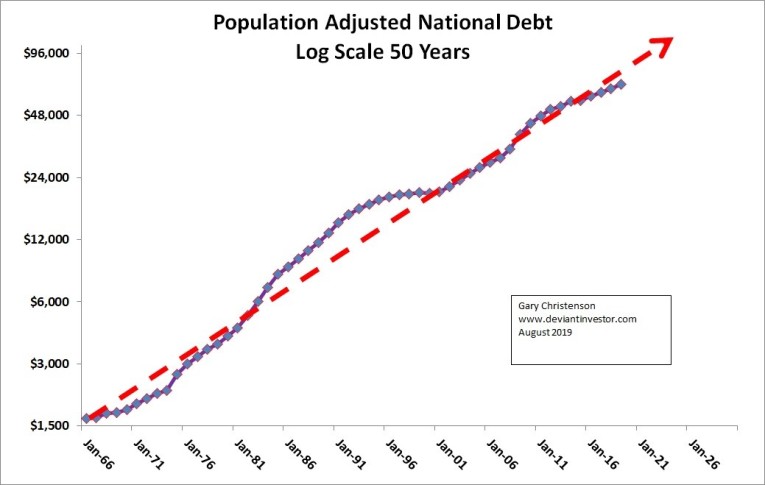 Debt increases more rapidly than the population. Examine this (scary) log scale chart of official national debt divided by US population.