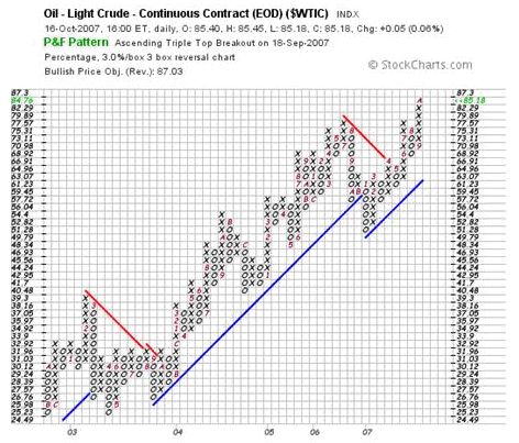 The Point and Figure Chart below (courtesy stockcharts.com) is showing that oil has been in a strongly rising trend and may be poised to rise to $87 a barrel.