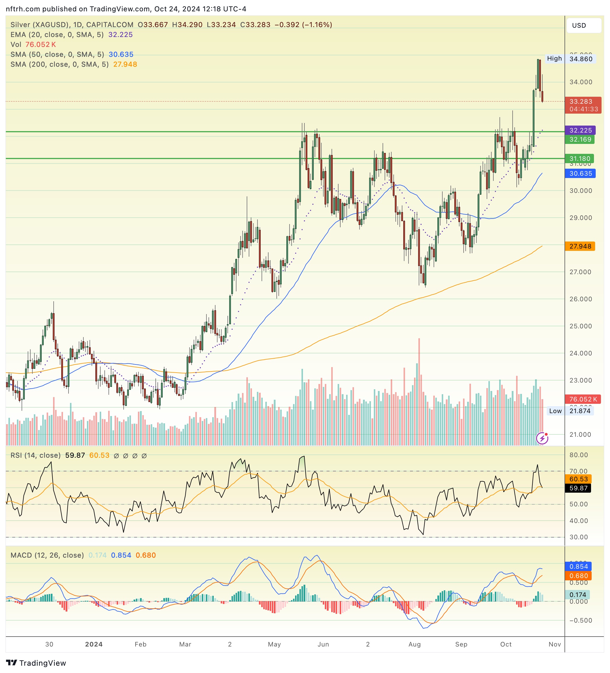 There is technical potential for a pullback in silver to 32.20 or even to 31, toward which the 50 day average is rising.