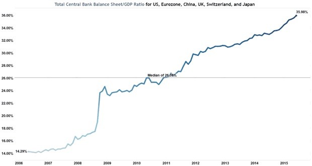 The world is currently witnessing unprecedented Central Bank interventions. The chart below displays a graph of the rise in the Central Banks' assets to GDP of all of the major economies globally. With yet another fresh round of QE, as announced by Japan and the EU, it appears that there is no end to the "madness".