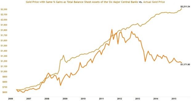 Even if Gold were to experience the same growth as the Central Banks' assets, it should be trading much higher. The chart below shows the valuation gap. With the world economy on tenterhooks, currency wars between nations are rapidly increasing. We have seen glimpses of such occurrences, when the Swiss Central Bank unpegged the Franc to the Euro, which in turn, led to massive bankruptcies.