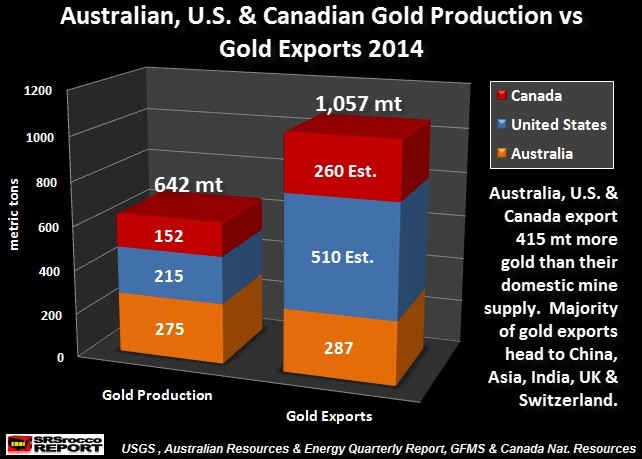 The data for Australia’s total gold exports of 287 mt in 2014 comes from the Australian Resources & Energy Quarterly Report, but the figures for the United States and Canada were my estimates based on data I received from the USGS and GFMS 2014 Gold Survey.