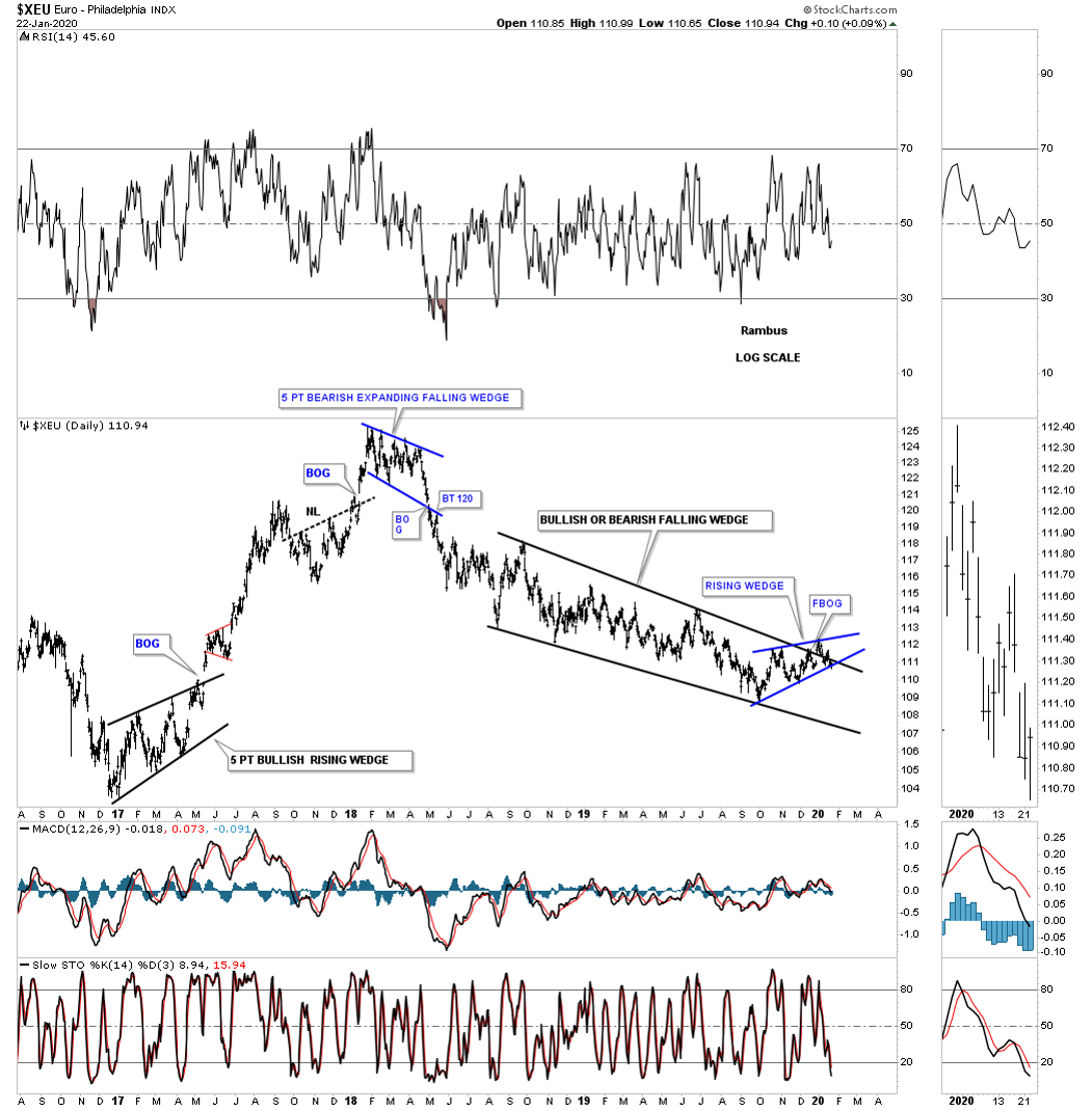 Lets change it up a bit and look at a daily chart for the $XEU, euro. If the US dollar is forming the 2018 rising wedge then the XEU will be forming a 2018 falling wedge of the same size. This long term daily chart shows the August 2018 falling wedge with a false breakout gap above the top rail. We looked at the possible small blue falling wedge on the US dollar earlier in this post while the XEU is forming a small blue rising wedge inversely to each other.