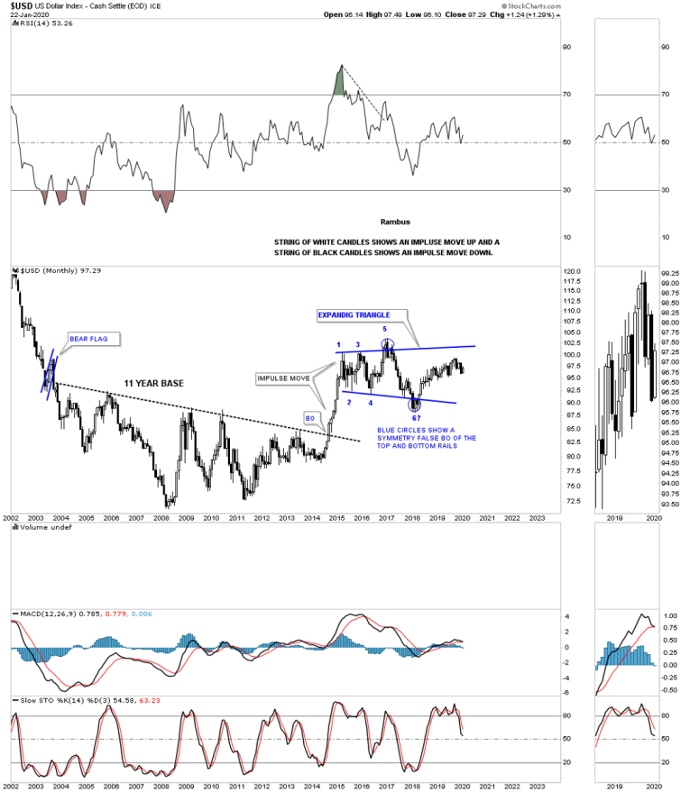 This next chart for the US dollar shows the impulse move out of big base #2. This is a good example of how a strong impulse move should look using monthly candlesticks. In a strong impulse move up you should see a string of white candlesticks all in a row. In a strong impulse move down you will generally see a string of black candlesticks all in a row.