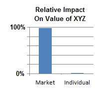 If we expand the XYZ analogy to the real world, it gets even more humbling. Facebook (FB) trades 65,000,000 shares on a typical day. It closed Friday at $64.32. If we assume the average FB trade is for $10,000 worth of stock, that means the average number of shares traded per individual transaction is 155 (10,000/64.32). A back of the napkin estimate of the number of people that trade Facebook every day comes to 419,354 (65M shares per day / 155 shares per individual transaction). Therefore, if I am trading Facebook, the impact of my personal opinion/research/forecast on the price of the stock is 1 divided by 419,354 or 0.00023%. The admittedly crude analysis tells us 99.977% of Facebook’s value is impacted by external factors that are in no way impacted by what “I think” or “what I think will happen next”.