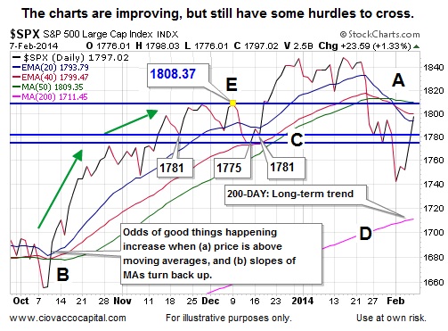 - Point A: The blue and red moving averages are trying to flatten out and turn up as they did in the early stages of the October 2013 rally in stocks (compare A and B).
