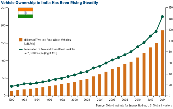 Contributing to India’s oil binge are policy changes that make its economy resemble China’s in the late 1990s, soon before its industrial boom. Compared to other major economies, India’s per capita consumption of oil is relatively low, as ownership of automobiles and motorcycles—many Indians’ preferred mode of personal transportation—is still developing, with penetration at merely 144 per 1,000 people. If we look just at passenger cars, the rate is closer to 17 per 1,000 people. (In the U.S., the figure is 850 per 1,000 people.)
