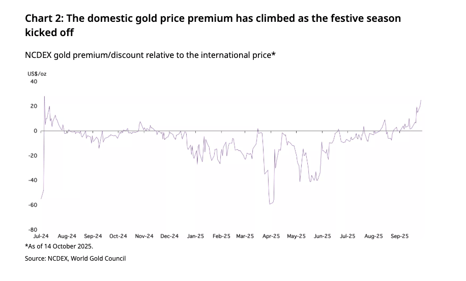 Prices rose even faster in rupee terms. By mid-October, the local price in India was at a $25 premium over international prices, signaling strong demand. This is the widest spread since July 2024, when the Indian government lowered the customs duty on gold and silver.