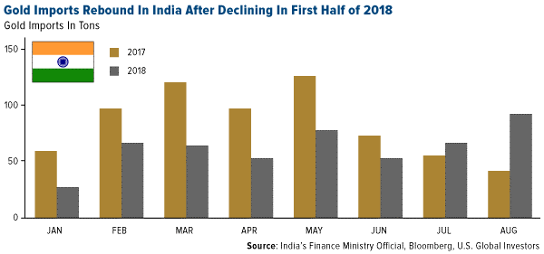 · Gold imports to India, the world’s second largest consumer of the yellow metal, more than doubled in August to their highest level in 15 months. Demand has been weak in India so far this year with imports falling 12.9 percent from a year earlier to 532.1 tonnes in the first eight months, according to data compiled by GFMS. The World Gold Council said that demand is expected to improve throughout the rest of the year as the government takes steps to boost farmers’ incomes, which would boost rural buying power.