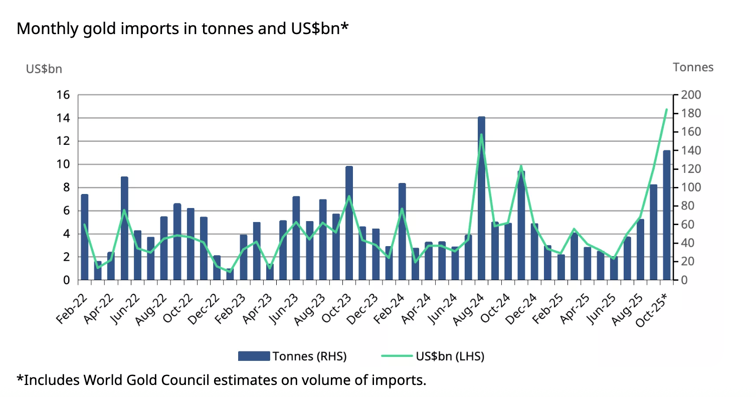 In tonnage terms, the World Gold Council estimates India imported between 137 and 142 tonnes of gold in October. That was up from 102 tonnes in September and 61 tonnes in September 2024.