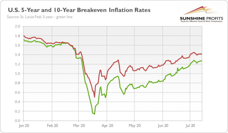Given the resurgence in the Covid-19 cases and the slowdown in the pace of the consumer spending and economic recovery, inflation may decline again in July. However, what is really important, is that the rising number of cases and reopening rollback have not yet impacted long-term inflation expectations, as the chart below shows. This is good news for the gold market, as the higher inflation expectations, the lower real interest rates.