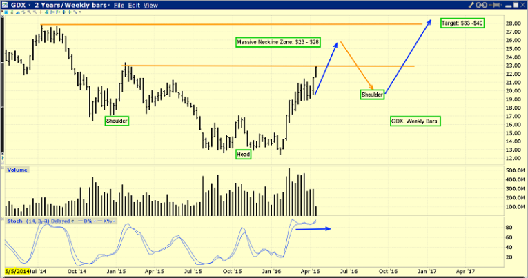 This is a picture of the big gold stocks from a technical standpoint. This weekly GDX chart shows the development of a massive inverse head and shoulders bottom.
