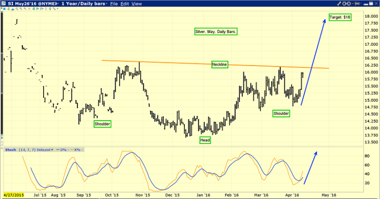 This daily chart shows silver poised to burst up from its own inverse head and shoulders bottom, and race towards my $18 target zone.