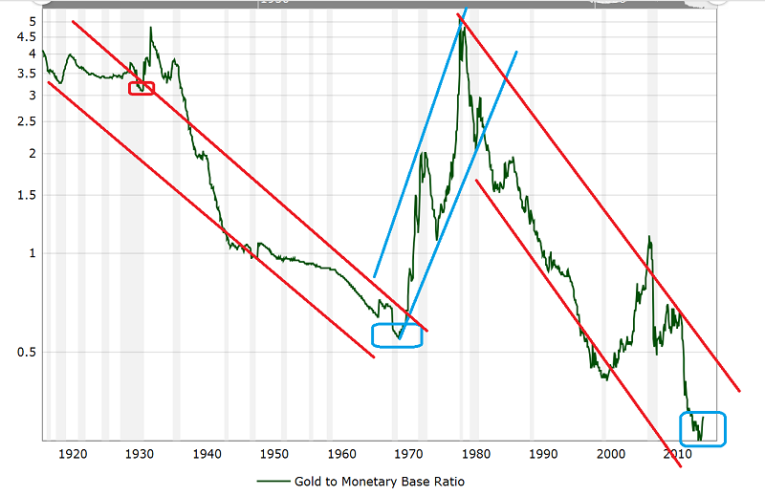 When yields enter a bull market, it’s generally reflected in the gold price as a ratio against the US monetary base. That’s the gold versus money base long term chart, courtesy of macrotrends.net.