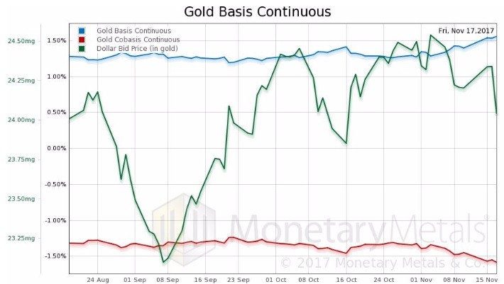 Here is the gold graph showing gold basis and cobasis with the price of the dollar in gold terms.