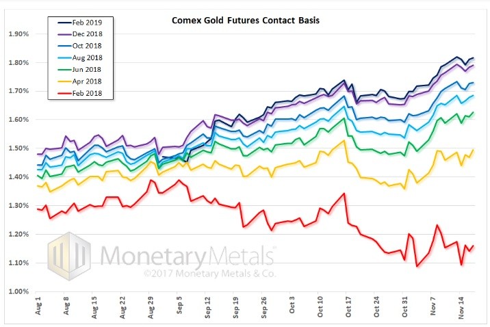 We don’t know the answer but we suspect it may be the lifting of hedges either in the gold mining sector, or perhaps more likely, the bullion dealers. We know that retail product premia are low, due to low retail demand. It seems plausible that dealers would reduce their hedge positions. Since hedging involves buying physical metal product and selling futures (which tends to compress the basis), lifting a hedge involves selling the product and buying the futures. Which tends to push the basis up, and not necessarily the near contract basis. The basis of whichever contracts were used for hedging. It could be longer contracts.