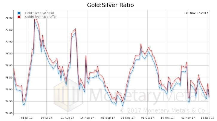 Next, this is a graph of the gold price measured in silver, otherwise known as the gold to silver ratio. The ratio fell.