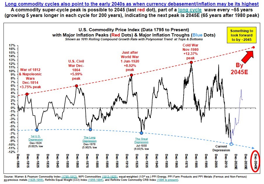 Before we look at my long term charts I would like to show you a couple of graphs which represents periods of inflation with this first graph going all the way back to 1795. The last super cycle peak of inflation ended in 1980 with a secondary peak in 2014 where my long term chart picks up the action that we’ll look at later on. The history of the graph below ended before the March 2020 low but you can see the actual low was close at hand. From cycle peak to cycle peak and growing by five years the next super cycle peak for inflation should be found around the 2045 area if history is any guide.