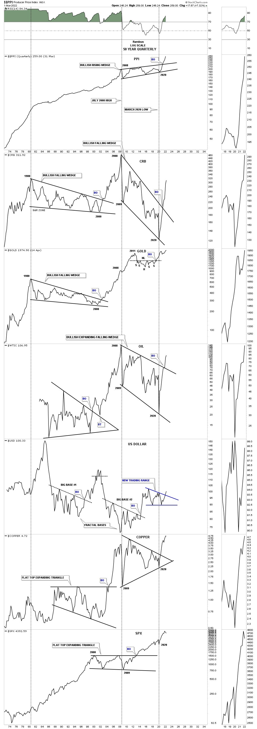 This first chart is a 30 year look at the PPI which basically shows inflation has been part of our history on an ongoing basis. Inflation took a 12 year break between 2008 and the March 2020 low building out the bullish expanding rising wedge. Just one year later in March of 2021 the PPI broke out from that very large bullish expanding rising wedge and hasn’t looked back. Note the last reversal point in that bullish expanding rising wedge was the March 2020 low.