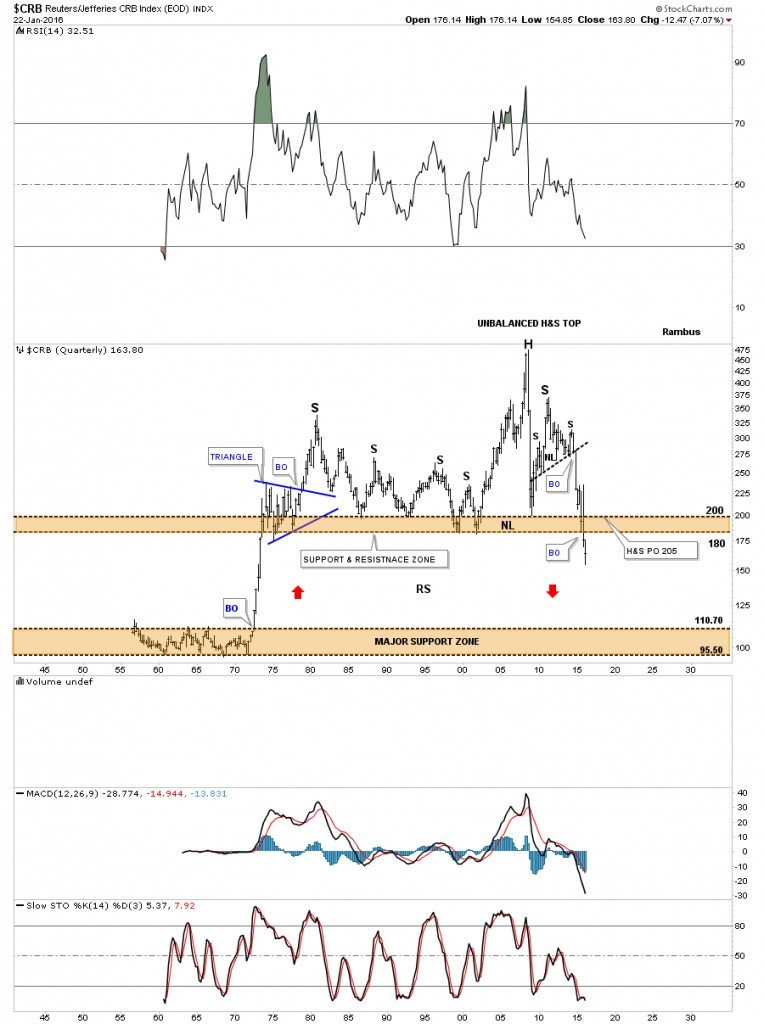 Next I would like to focus in on this long term quarterly chart for the CRB index which I originally built back in 2013 when the H&S consolidation pattern was still under construction. I had always shown the upper brown shaded support and resistance zone as major support through the years but with that H&S consolidation looming I thought there could be a chance that the CRB index could take out that very critical support zone.